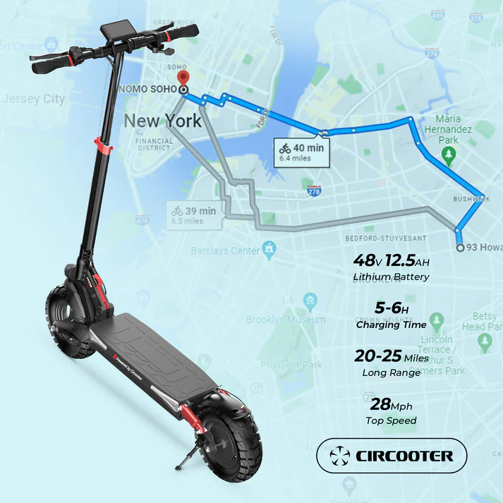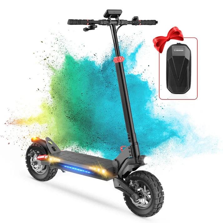 The Circooter Mate Pro All-terrain Electric scooter offers a balanced mix of power and adaptability. Designed to cater to both daily commuting and off-road expeditions, it boasts a 48V peak 1000W brushless hub motor for robust acceleration and dependable performance. With a range of up to 40 KM on a full charge, and an upgraded front swing arm suspension for a comfortable and stable journey, this e-scooter is equipped to handle any terrain with its durable off-road hollow tires. Furthermore, its quick 3-second folding mechanism allows for effortless storage and portability.