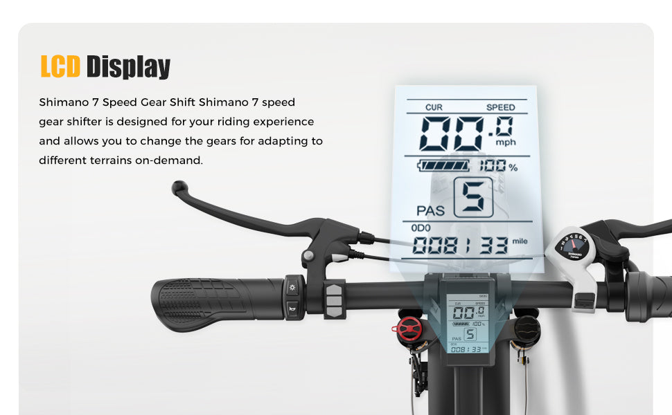 Designed for comfort and durability, the 20" x 4” fat tires provide excellent traction and stability on various terrains, while the dual shock absorbers enhance ride smoothness. A Shimano 7-speed drivetrain ensures a seamless riding experience, whether you're tackling hills or cruising on flat roads. Safety is also a priority, with a bright LCD display for real-time ride data and a smart lighting system featuring USB-rechargeable front and rear lights. The handlebar-mounted wireless remote allows easy control of the rear turn signals, ensuring visibility and safety on the road.