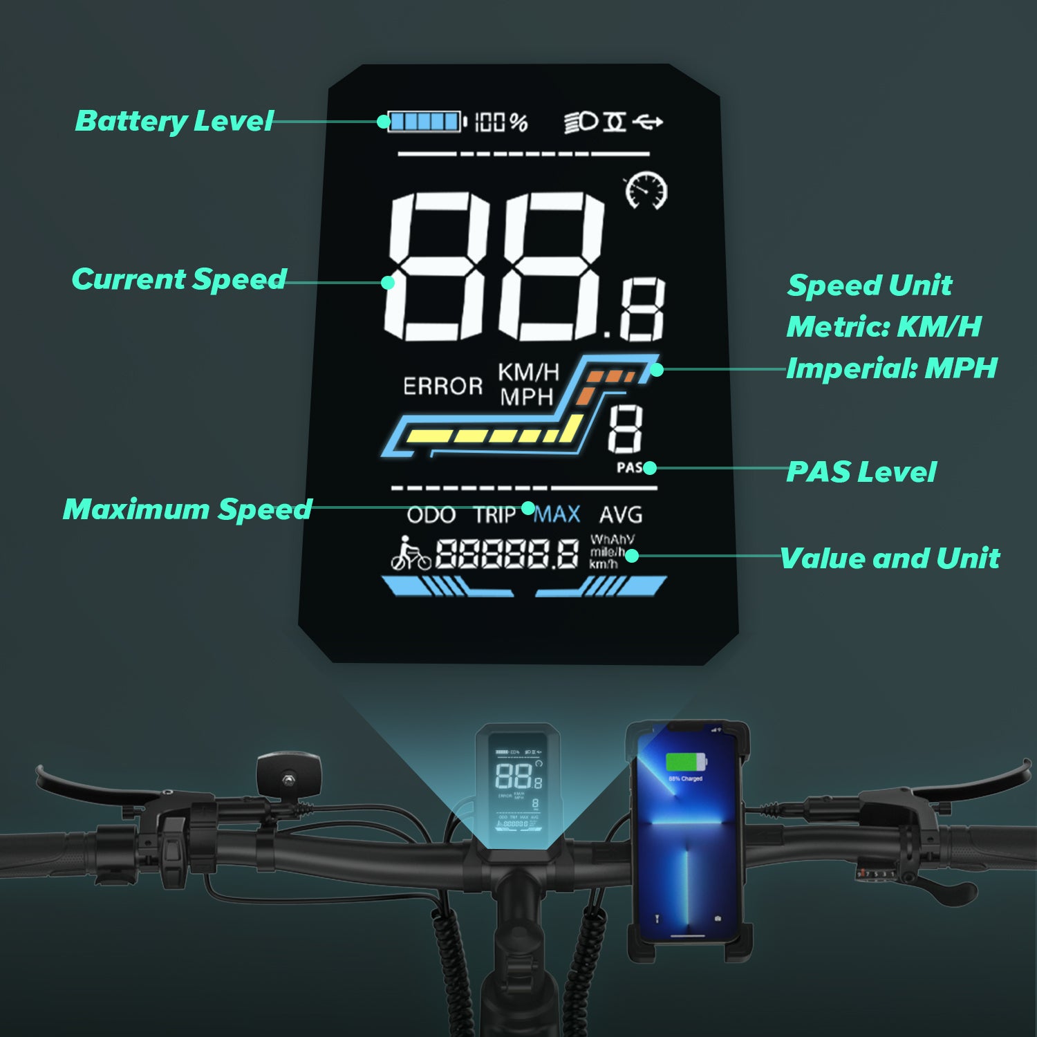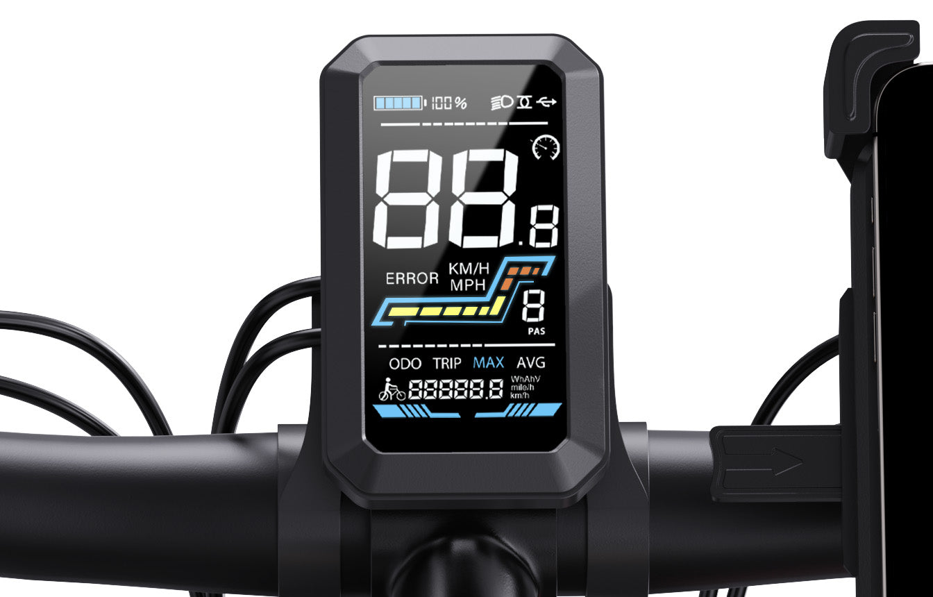 The CycUltra is built with a 6061 aluminum frame, offering strength without excessive weight. A super-soft cushioned saddle and heavy-duty aluminum kickstand add to rider comfort and convenience. The integrated front and warning tail lights enhance visibility for safer night rides, and the color LCD display with USB charging keeps you informed on speed, battery life, and more.